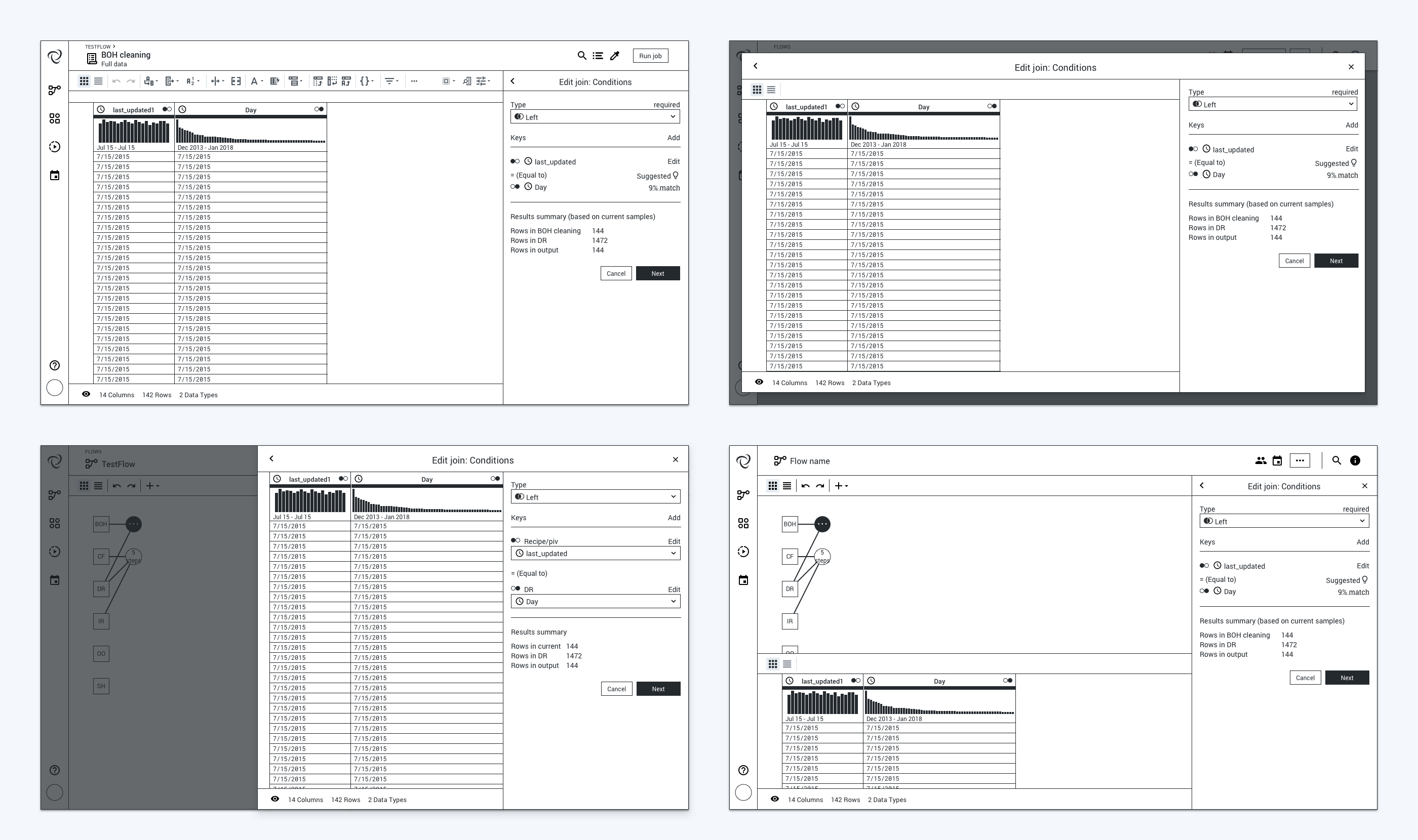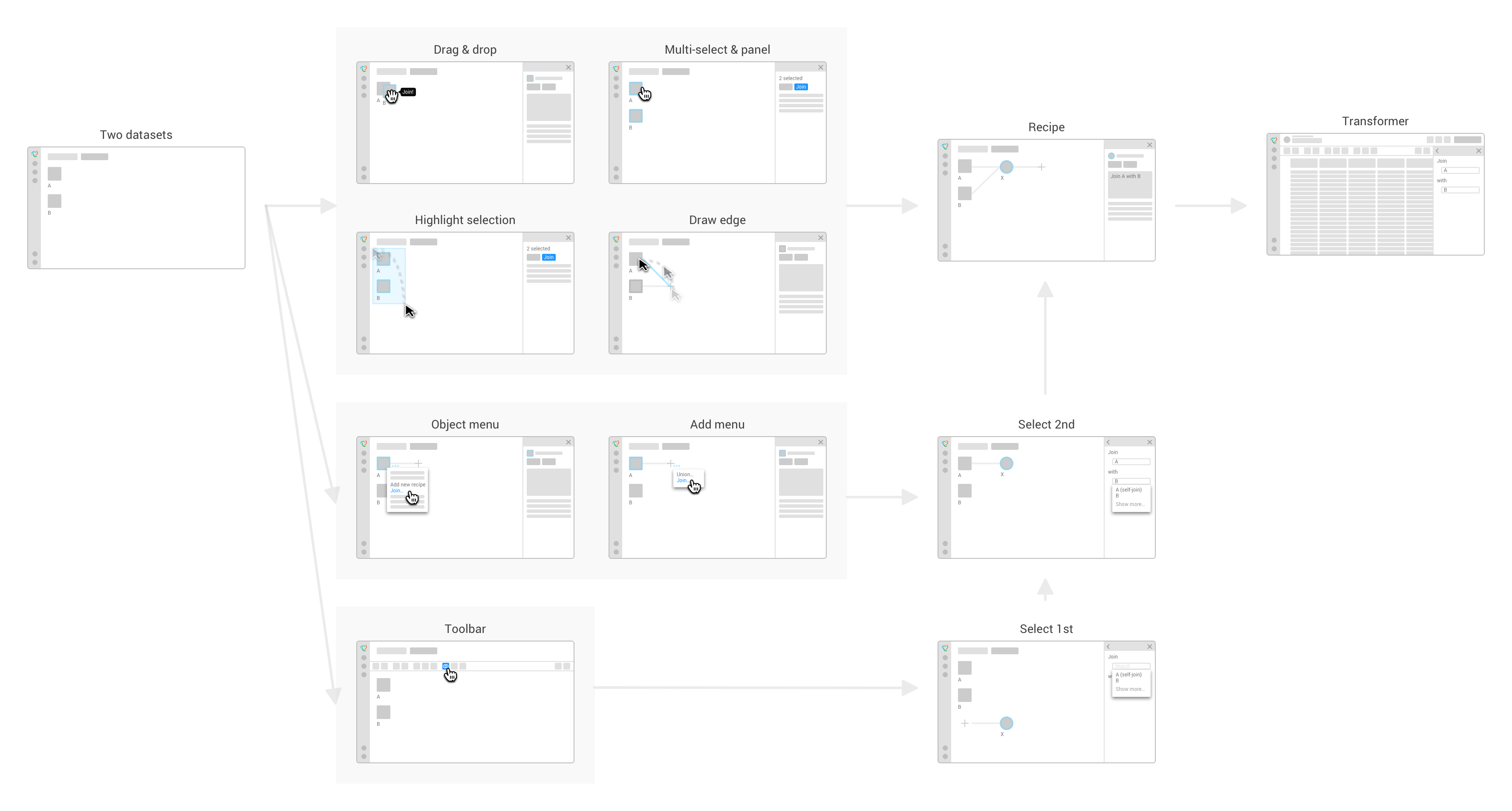 Solution Designed an improved interaction workflow for joining and unioning from the flow view, a more transparent representation of objects/information, and a system of relaxed yet predictable layout rules.